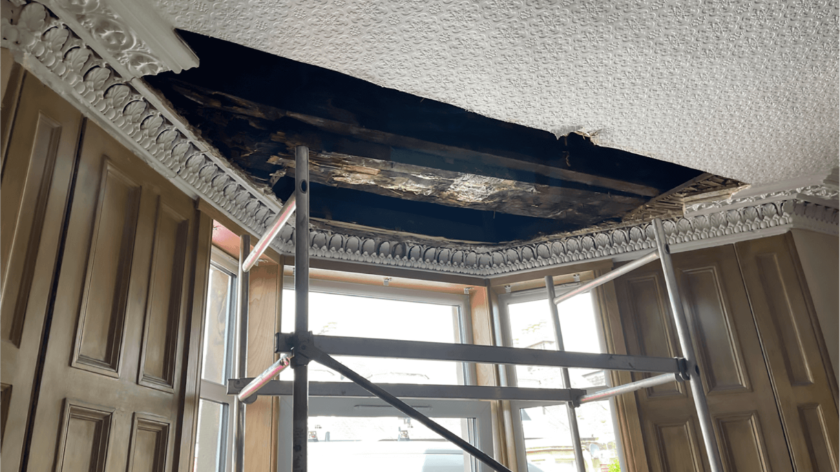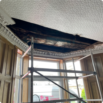 We recommended internal scaffolding to dismantle and repair the suspended ceiling along with replacing wall frames where necessary substituting accordingly. New plasterboard, skirtings and facings would be installed post-sterilisation.